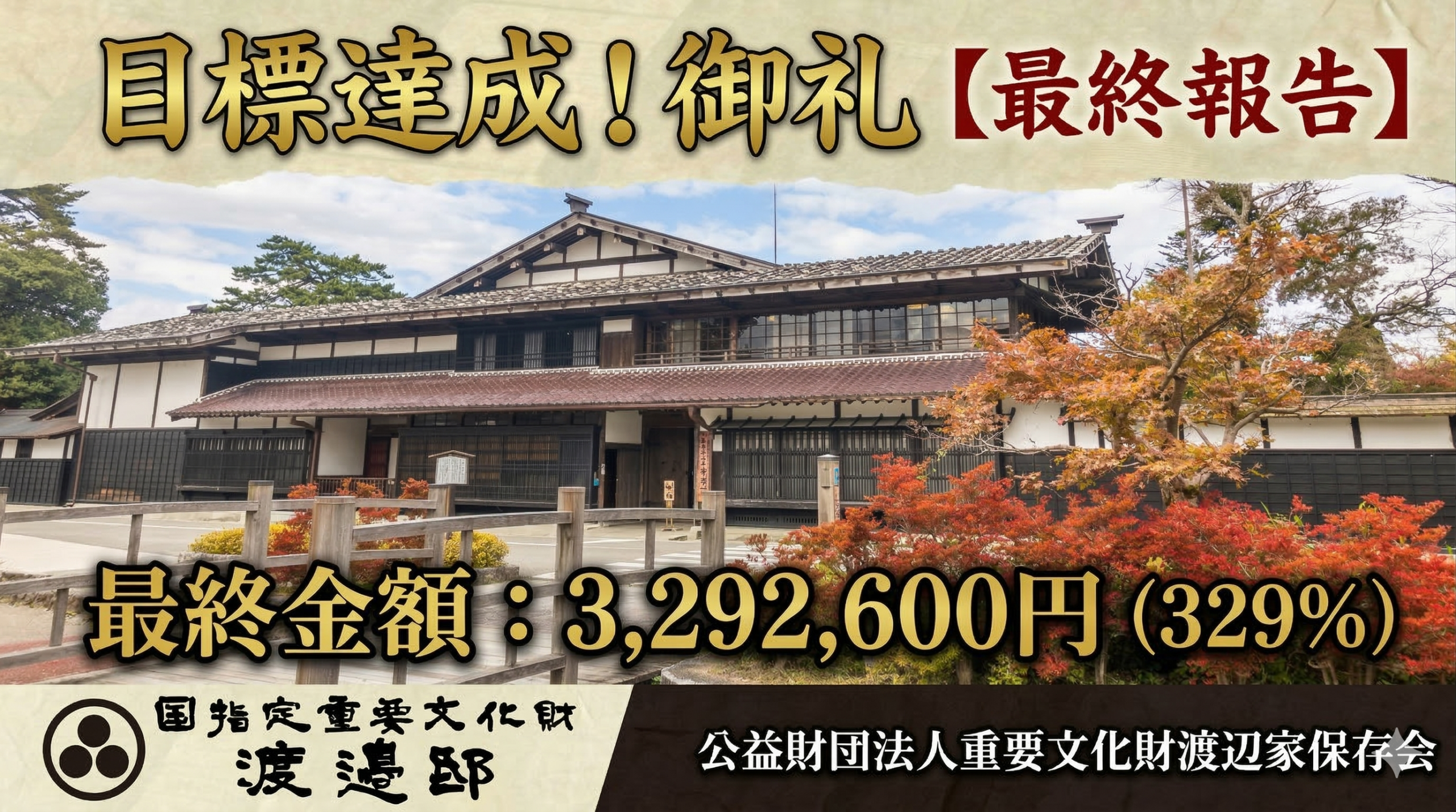 当初の目標を大きく上回る、329%という驚くべき達成率で幕を閉じることができました。この数字は、皆様がこの国の重要文化財である渡邉邸を「未来へ残すべき宝」として大切に思ってくださっている証であり、私たちにとって何よりの励みとなりました。