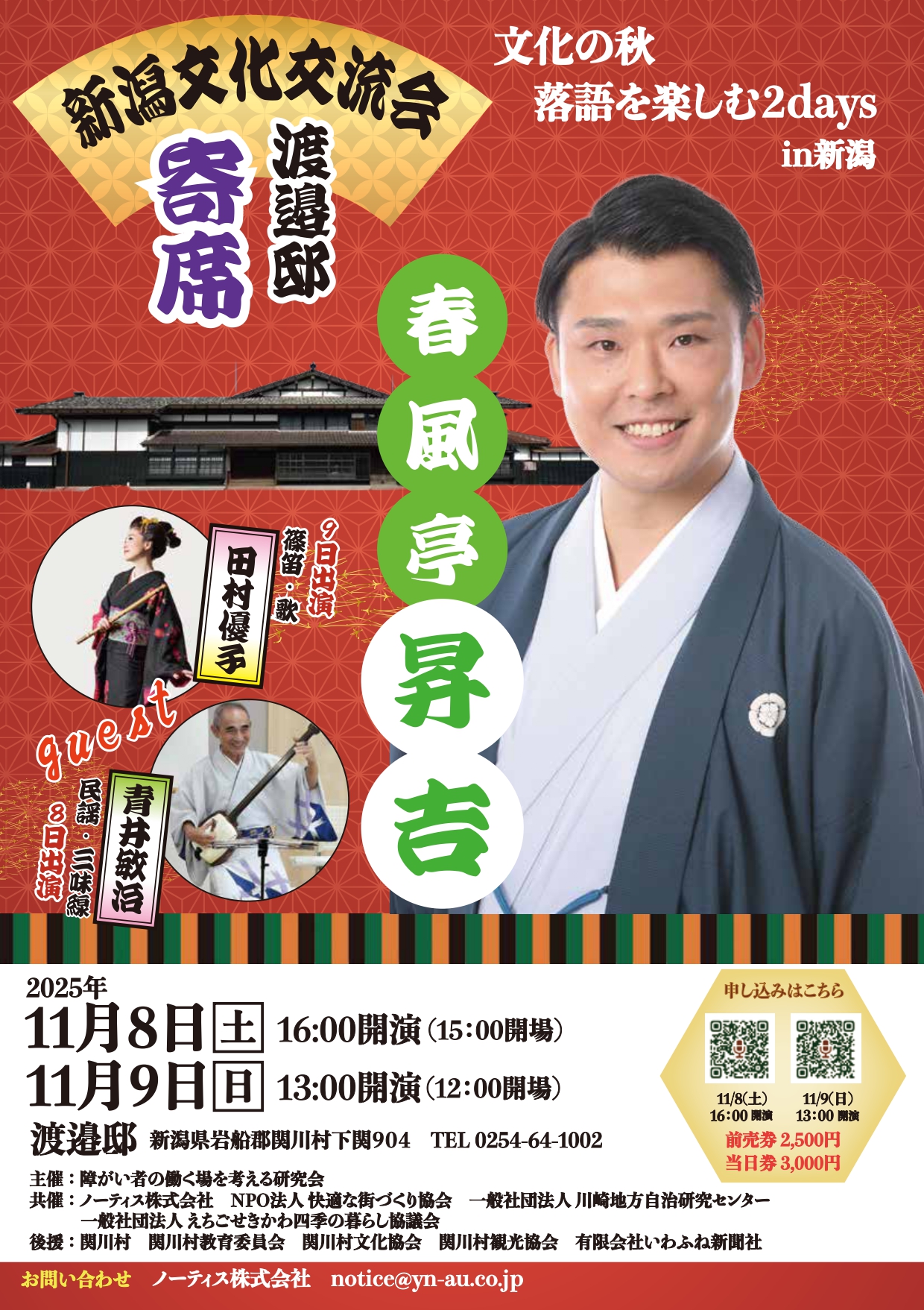 2025年11月8日(土)、9日(日)は、館内にて新潟文化交流会 渡邉邸寄席開催のため、